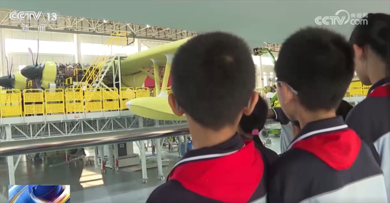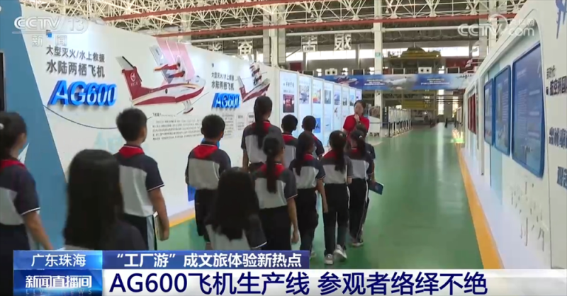 珠海金湾区的AG600总装生产车间是全国唯一一个对公众开放的特种大飞机的生产线,来自珠海一个小学的学生到达这里参观。